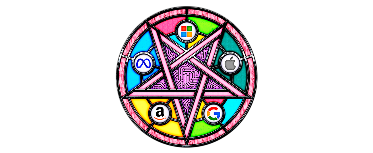 “Combregueu i accepteu els TERMES I CONDICIONS dels himnes corporatius d’aquest TOP 5 de regnes cibermedievals amb major capitalització borsària. MICROSOFT, META, AMAZON, GOOGLE I APPLE [MMAGA]. Perquè són ells els nostres senyors tecnofeudals i nosaltres, les seves vassalles, les USERF, sembrem les seves plataformes amb la nostra data-blood.”