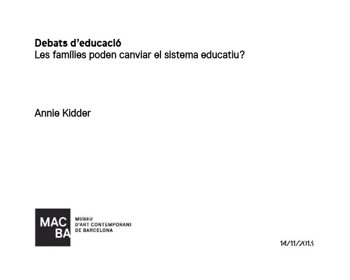 Enregistrament audiovisual realitzat amb motiu de l'activitat "Debats d'educació. Annie Kidder. Les famílies poden canviar el sistema educatiu?", celebrada al Museu d’Art Contemporani de Barcelona (MACBA), el 14 de novembre de 2013.