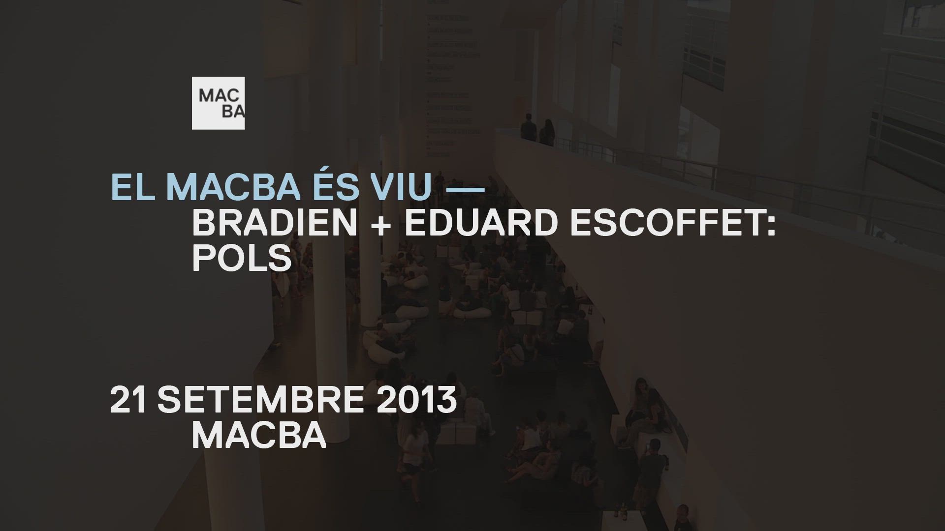 Enregistrament audiovisual realitzat amb motiu de l’activitat MACBA es viu: "Bradien + Eduard Escoffet: Pols" celebrada al Museu d'Art Contemporani de Barcelona (MACBA), el 21 de setembre de 2013.