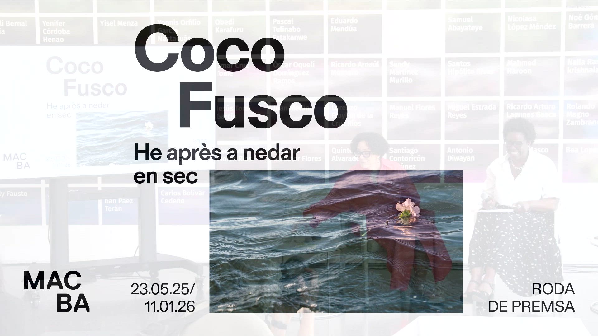 Enregistrament audiovisual de la roda de premsa de l'exposició de l'artista Coco Fusco "He après a nedar en sec", celebrada al MACBA Museu d'Art Contemporani de Barcelona, el 21 de maig de 2025.