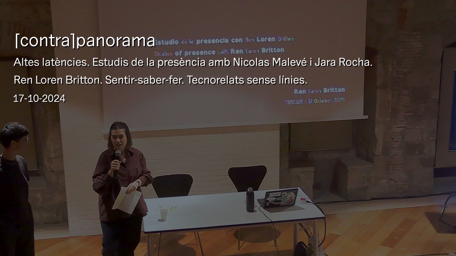 Enregistrament audiovisual de la presentació de l'estudi de la presència amb Ren Loren Britton en el context del projecte [contra]panorama, celebrada al MACBA Museu d'Art Contemporani de Barcelona, el 17 d'octubre de 2024.