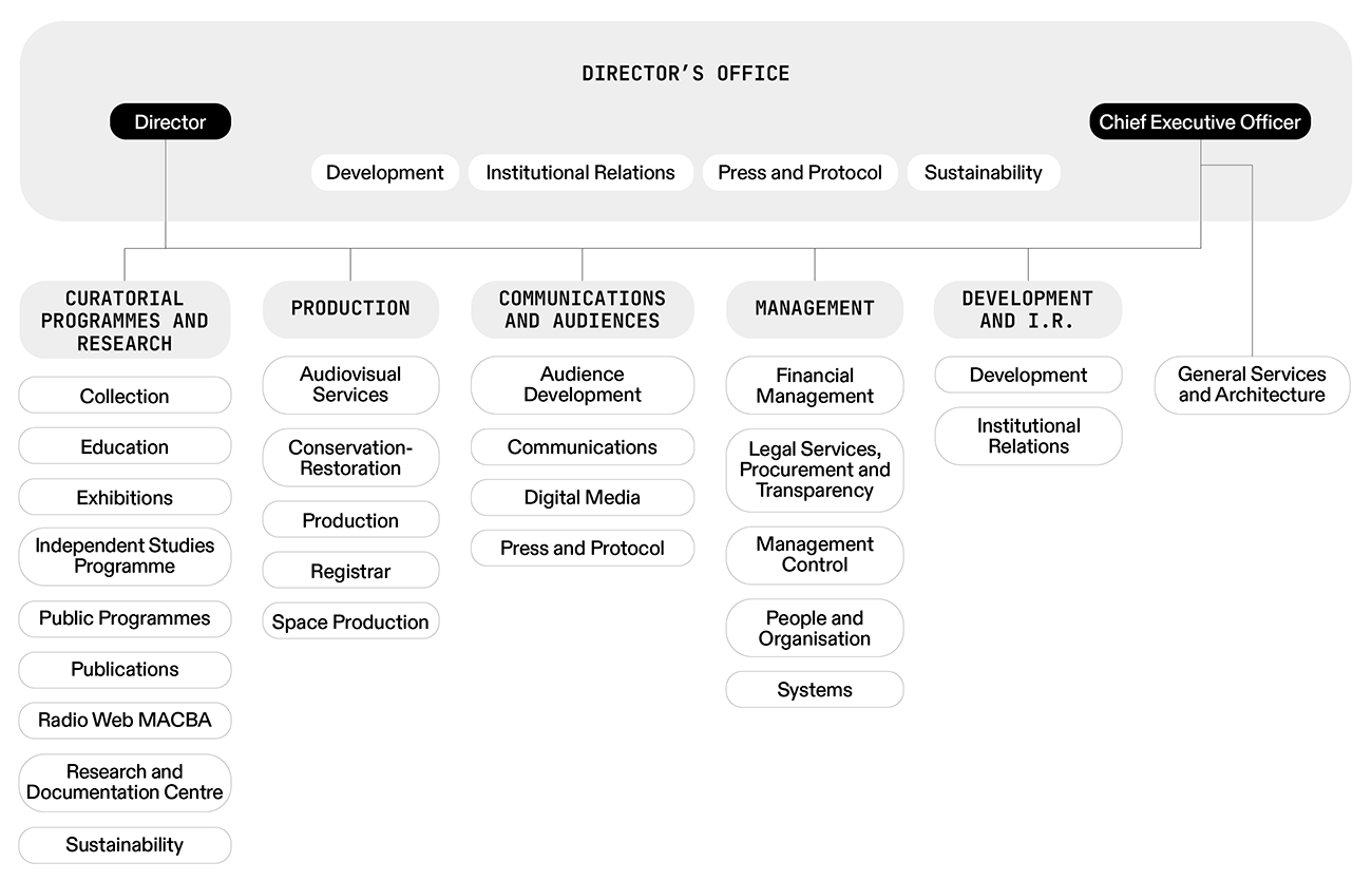 Director’s Office Curatorial Programmes and Research Production Communications and Audiences Management Development and Institutional Relations General Services and Architecture