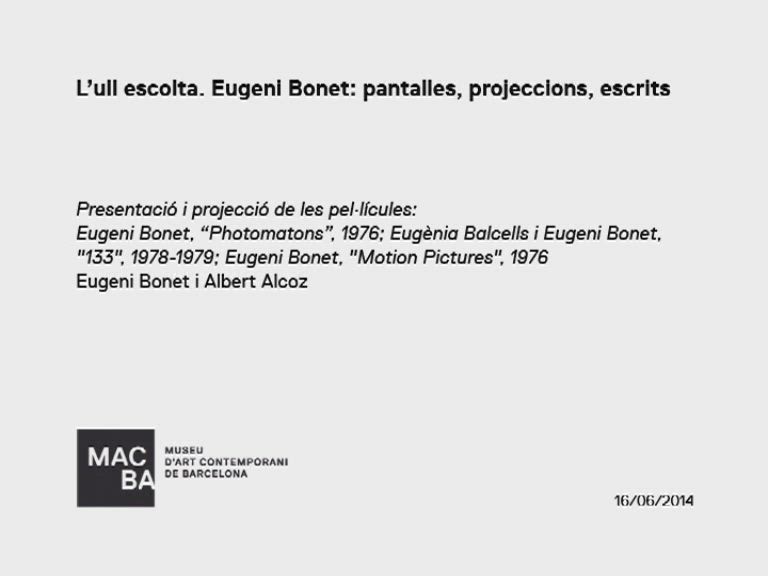 Enregistrament audiovisual de la presentació i projecció de les pel·lícules "Photomatons" (1976) d'Eugeni Bonet, "133" (1978-1979) d'Eugènia Balcells i Eugeni Bonet, "Motion pictures" (1976) d'Eugeni Bonet, realitzada amb motiu de l'exposició "L'ull escolta. Eugeni Bonet: Pantalles, projeccions, escrits", celebrada al Museu d'Art Contemporani de Barcelona (MACBA), el 16 de juny de 2014.