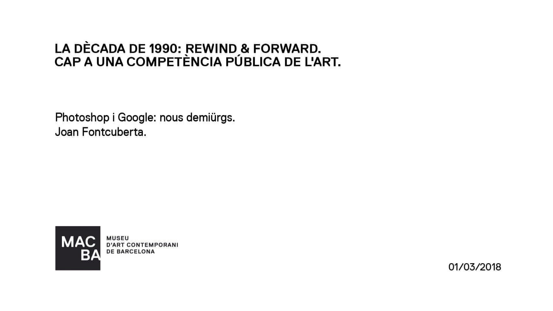 Enregistrament audiovisual de la sessió “The 1990's. Rewind & Forward. Towards art's public Photoshop i Google: Nous demiürgs" realitzada amb motiu del curs "La dècada de 1990: Rewind & Forward. Cap a una competència pública de l'art. Curs d'art i cultura contemporània", celebrat al Museu d’Art Contemporani de Barcelona (MACBA), l'1 de març de 2018.