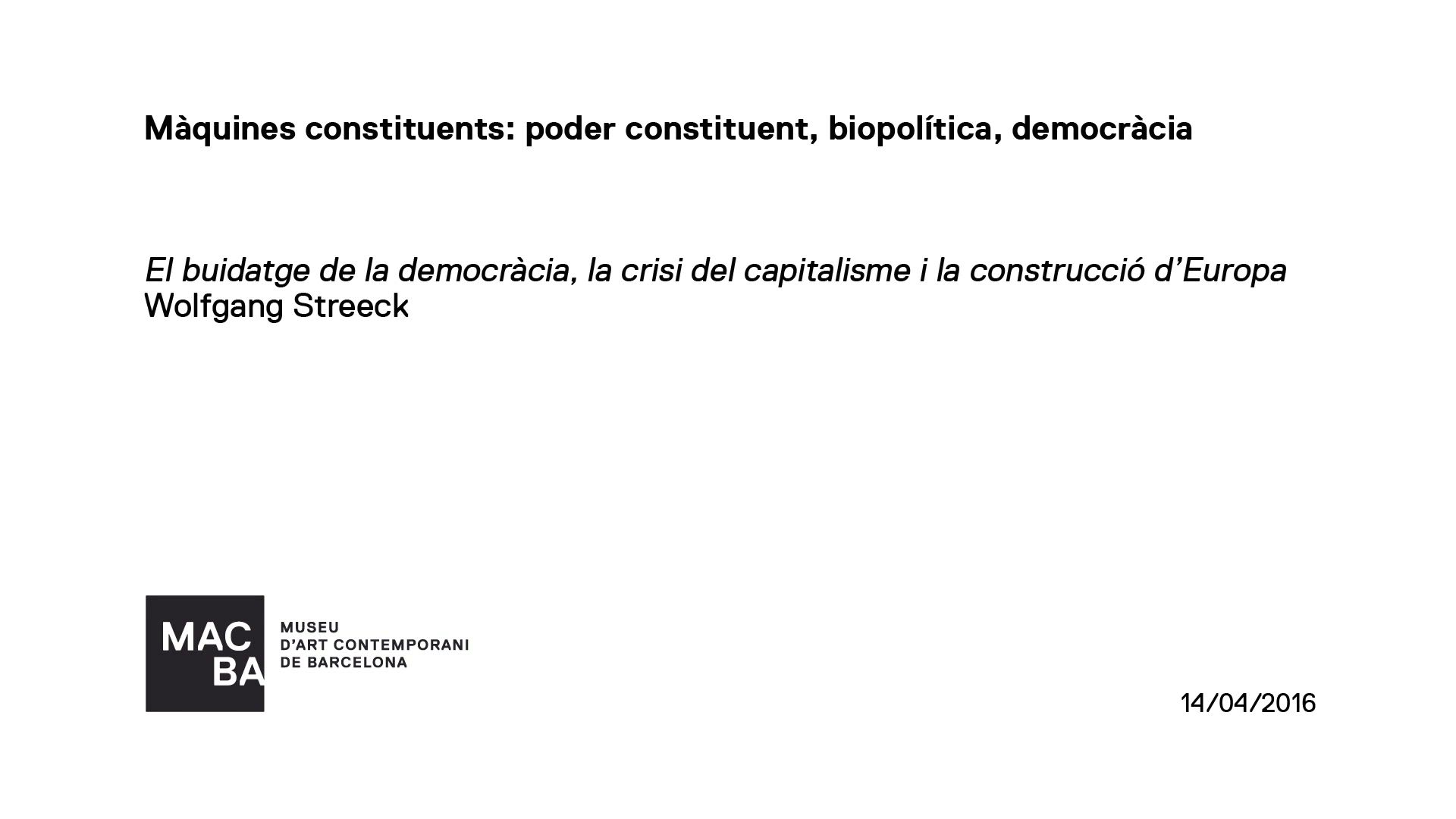 [DIG_A.HIS.04526_001 / Enregistrament audiovisual] A.HIS.04526 - El buidatge de la democràcia, la crisi del capitalisme i la construcció d’Europa -- Màquines constituents: poder constituent, biopolítica, democràcia. Wolfgang Streeck [Enregistrament audiovisual activitat] [enregistrament audiovisual], MACBA Museu d'Art Contemporani de Barcelona, Wolfgang Streeck, Carlos Prieto, Departament de Programes Públics i Educació. MACBA, 14-4-2016