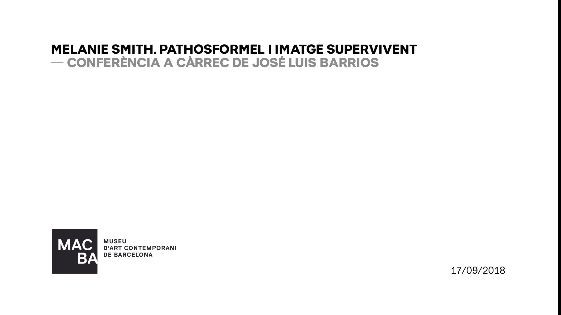 Enregistrament audiovisual realitzat amb motiu de l’activitat “Melanie Smith. Pathosformel i imatge supervivent. Conferència a càrrec de José Luis Barrios" celebrada al Museu d’Art Contemporani de Barcelona (MACBA), el 17 de setembre de 2018.